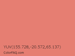 YUV 155.728,-20.572,65.137 Color is a light red color and the nearest color is Candy Pink #e4717a. Hex code #e67e72 and RGB value is rgb(230,126,114). In RGB color space, this color is composed of 90% red, 49% green, 45% blue, In CMYK color space, this color is composed of 0% cyan, 45% magenta, 50% yellow , 10% black , In HSL color space, this color has a hue angle of 6° , 70% saturation and 67% lightness.