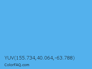 YUV 155.734,40.064,-63.788 Color is a light blue color and the nearest color is Blue Jeans #5dadec. Hex code #53b1ed and RGB value is rgb(83,177,237). In RGB color space, this color is composed of 33% red, 69% green, 93% blue, In CMYK color space, this color is composed of 65% cyan, 25% magenta, 0% yellow , 7% black , In HSL color space, this color has a hue angle of 203° , 81% saturation and 63% lightness.