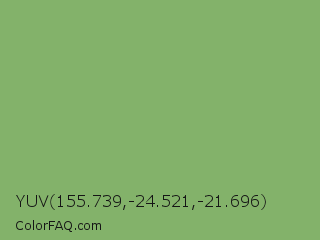 YUV 155.739,-24.521,-21.696 Color is a normal green color and the nearest color is Asparagus #87a96b. Hex code #83b26a and RGB value is rgb(131,178,106). In RGB color space, this color is composed of 51% red, 70% green, 42% blue, In CMYK color space, this color is composed of 26% cyan, 0% magenta, 40% yellow , 30% black , In HSL color space, this color has a hue angle of 99° , 32% saturation and 56% lightness.