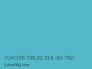 YUV 155.739,22.314,-63.792 Color is a normal cyan color and the nearest color is Fountain Blue #56b4be. Hex code #53b8c9 and RGB value is rgb(83,184,201). In RGB color space, this color is composed of 33% red, 72% green, 79% blue, In CMYK color space, this color is composed of 59% cyan, 8% magenta, 0% yellow , 21% black , In HSL color space, this color has a hue angle of 189° , 52% saturation and 56% lightness.