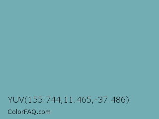 YUV 155.744,11.465,-37.486 Color is a normal cyan color and the nearest color is Moonstone Blue #73a9c2. Hex code #71adb3 and RGB value is rgb(113,173,179). In RGB color space, this color is composed of 44% red, 68% green, 70% blue, In CMYK color space, this color is composed of 37% cyan, 3% magenta, 0% yellow , 30% black , In HSL color space, this color has a hue angle of 185° , 30% saturation and 57% lightness.