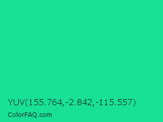 YUV 155.764,-2.842,-115.557 Color is a normal green color and the nearest color is Caribbean Green #00cc99. Hex code #18e096 and RGB value is rgb(24,224,150). In RGB color space, this color is composed of 9% red, 88% green, 59% blue, In CMYK color space, this color is composed of 89% cyan, 0% magenta, 33% yellow , 12% black , In HSL color space, this color has a hue angle of 158° , 81% saturation and 49% lightness.
