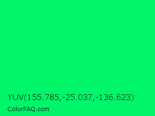 YUV 155.785,-25.037,-136.623 Color is a normal green color and the nearest color is Spring Green #00ff7f. Hex code #00f569 and RGB value is rgb(0,245,105). In RGB color space, this color is composed of 0% red, 96% green, 41% blue, In CMYK color space, this color is composed of 100% cyan, 0% magenta, 57% yellow , 4% black , In HSL color space, this color has a hue angle of 146° , 100% saturation and 48% lightness.