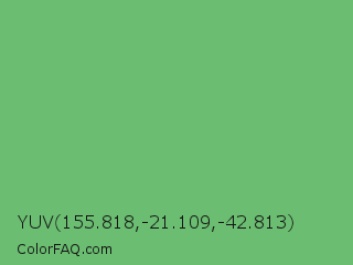 YUV 155.818,-21.109,-42.813 Color is a normal green color and the nearest color is Iguana Green #71bc78. Hex code #6bbd71 and RGB value is rgb(107,189,113). In RGB color space, this color is composed of 42% red, 74% green, 44% blue, In CMYK color space, this color is composed of 43% cyan, 0% magenta, 40% yellow , 26% black , In HSL color space, this color has a hue angle of 124° , 38% saturation and 58% lightness.