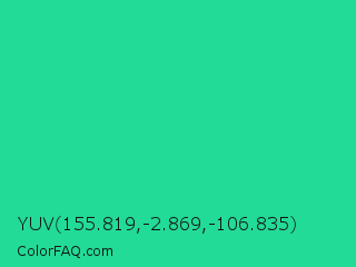 YUV 155.819,-2.869,-106.835 Color is a normal green color and the nearest color is Shamrock #33cc99. Hex code #22db96 and RGB value is rgb(34,219,150). In RGB color space, this color is composed of 13% red, 86% green, 59% blue, In CMYK color space, this color is composed of 84% cyan, 0% magenta, 32% yellow , 14% black , In HSL color space, this color has a hue angle of 158° , 73% saturation and 50% lightness.