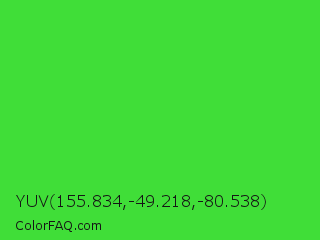 YUV 155.834,-49.218,-80.538 Color is a normal green color and the nearest color is Lime Green #32cd32. Hex code #40de38 and RGB value is rgb(64,222,56). In RGB color space, this color is composed of 25% red, 87% green, 22% blue, In CMYK color space, this color is composed of 71% cyan, 0% magenta, 75% yellow , 13% black , In HSL color space, this color has a hue angle of 117° , 72% saturation and 55% lightness.