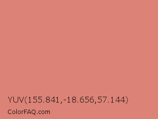 YUV 155.841,-18.656,57.144 Color is a light red color and the nearest color is New York Pink #d7837f. Hex code #dd8276 and RGB value is rgb(221,130,118). In RGB color space, this color is composed of 87% red, 51% green, 46% blue, In CMYK color space, this color is composed of 0% cyan, 41% magenta, 47% yellow , 13% black , In HSL color space, this color has a hue angle of 7° , 60% saturation and 66% lightness.