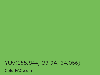 YUV 155.844,-33.94,-34.066 Color is a normal green color and the nearest color is Bud Green #7bb661. Hex code #75bd57 and RGB value is rgb(117,189,87). In RGB color space, this color is composed of 46% red, 74% green, 34% blue, In CMYK color space, this color is composed of 38% cyan, 0% magenta, 54% yellow , 26% black , In HSL color space, this color has a hue angle of 102° , 44% saturation and 54% lightness.