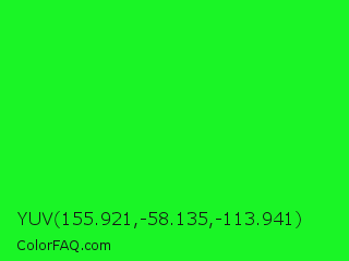 YUV 155.921,-58.135,-113.941 Color is a normal green color and the nearest color is Neon Green #39ff14. Hex code #1af526 and RGB value is rgb(26,245,38). In RGB color space, this color is composed of 10% red, 96% green, 15% blue, In CMYK color space, this color is composed of 89% cyan, 0% magenta, 84% yellow , 4% black , In HSL color space, this color has a hue angle of 123° , 92% saturation and 53% lightness.