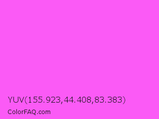 YUV 155.923,44.408,83.383 Color is a light magenta color and the nearest color is Pink Flamingo Crayola #ff66ff. Hex code #fb5af6 and RGB value is rgb(251,90,246). In RGB color space, this color is composed of 98% red, 35% green, 96% blue, In CMYK color space, this color is composed of 0% cyan, 64% magenta, 2% yellow , 2% black , In HSL color space, this color has a hue angle of 302° , 95% saturation and 67% lightness.