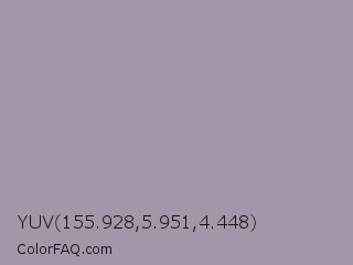 YUV 155.928,5.951,4.448 Color is a light purple color and the nearest color is Heliotrope Gray #aa98a9. Hex code #a197a8 and RGB value is rgb(161,151,168). In RGB color space, this color is composed of 63% red, 59% green, 66% blue, In CMYK color space, this color is composed of 4% cyan, 10% magenta, 0% yellow , 34% black , In HSL color space, this color has a hue angle of 275° , 9% saturation and 63% lightness.