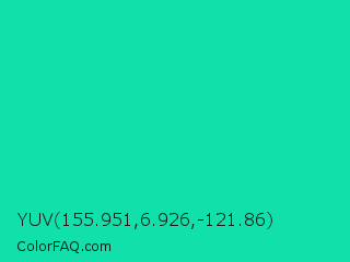 YUV 155.951,6.926,-121.86 Color is a normal cyan color and the nearest color is Caribbean Green #00cc99. Hex code #11e0aa and RGB value is rgb(17,224,170). In RGB color space, this color is composed of 7% red, 88% green, 67% blue, In CMYK color space, this color is composed of 92% cyan, 0% magenta, 24% yellow , 12% black , In HSL color space, this color has a hue angle of 164° , 86% saturation and 47% lightness.
