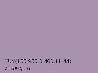 YUV 155.955,8.403,11.44 Color is a light purple color and the nearest color is Glossy Grape #ab92b3. Hex code #a992ad and RGB value is rgb(169,146,173). In RGB color space, this color is composed of 66% red, 57% green, 68% blue, In CMYK color space, this color is composed of 2% cyan, 16% magenta, 0% yellow , 32% black , In HSL color space, this color has a hue angle of 291° , 14% saturation and 63% lightness.