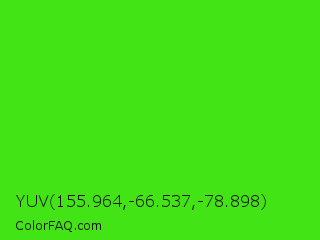 YUV 155.964,-66.537,-78.898 Color is a normal green color and the nearest color is Harlequin Green #46cb18. Hex code #42e415 and RGB value is rgb(66,228,21). In RGB color space, this color is composed of 26% red, 89% green, 8% blue, In CMYK color space, this color is composed of 71% cyan, 0% magenta, 91% yellow , 11% black , In HSL color space, this color has a hue angle of 107° , 83% saturation and 49% lightness.