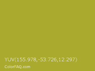 YUV 155.978,-53.726,12.297 Color is a normal yellow color and the nearest color is Lemon Ginger #ac9e22. Hex code #aaaa2f and RGB value is rgb(170,170,47). In RGB color space, this color is composed of 67% red, 67% green, 18% blue, In CMYK color space, this color is composed of 0% cyan, 0% magenta, 72% yellow , 33% black , In HSL color space, this color has a hue angle of 60° , 57% saturation and 43% lightness.