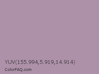 YUV 155.994,5.919,14.914 Color is a light magenta color and the nearest color is Lilac Luster #ae98aa. Hex code #ad91a8 and RGB value is rgb(173,145,168). In RGB color space, this color is composed of 68% red, 57% green, 66% blue, In CMYK color space, this color is composed of 0% cyan, 16% magenta, 3% yellow , 32% black , In HSL color space, this color has a hue angle of 311° , 15% saturation and 62% lightness.