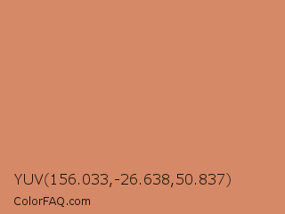 YUV 156.033,-26.638,50.837 Color is a light orange color and the nearest color is Copperfield #da8a67. Hex code #d68966 and RGB value is rgb(214,137,102). In RGB color space, this color is composed of 84% red, 54% green, 40% blue, In CMYK color space, this color is composed of 0% cyan, 36% magenta, 52% yellow , 16% black , In HSL color space, this color has a hue angle of 19° , 58% saturation and 62% lightness.