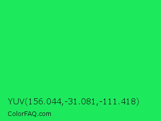 YUV 156.044,-31.081,-111.418 Color is a normal green color and the nearest color is Malachite #0bda51. Hex code #1de95d and RGB value is rgb(29,233,93). In RGB color space, this color is composed of 11% red, 91% green, 36% blue, In CMYK color space, this color is composed of 88% cyan, 0% magenta, 60% yellow , 9% black , In HSL color space, this color has a hue angle of 139° , 82% saturation and 51% lightness.