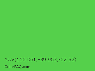 YUV 156.061,-39.963,-62.32 Color is a normal green color and the nearest color is Mantis #74c365. Hex code #55d04b and RGB value is rgb(85,208,75). In RGB color space, this color is composed of 33% red, 82% green, 29% blue, In CMYK color space, this color is composed of 59% cyan, 0% magenta, 64% yellow , 18% black , In HSL color space, this color has a hue angle of 115° , 59% saturation and 55% lightness.