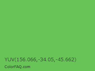 YUV 156.066,-34.05,-45.662 Color is a normal green color and the nearest color is Mantis #74c365. Hex code #68c457 and RGB value is rgb(104,196,87). In RGB color space, this color is composed of 41% red, 77% green, 34% blue, In CMYK color space, this color is composed of 47% cyan, 0% magenta, 56% yellow , 23% black , In HSL color space, this color has a hue angle of 111° , 48% saturation and 55% lightness.