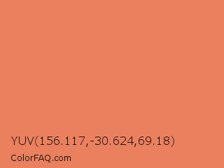 YUV 156.117,-30.624,69.18 Color is a light red color and the nearest color is Big Foot Feet #e88e5a. Hex code #eb805e and RGB value is rgb(235,128,94). In RGB color space, this color is composed of 92% red, 50% green, 37% blue, In CMYK color space, this color is composed of 0% cyan, 46% magenta, 60% yellow , 8% black , In HSL color space, this color has a hue angle of 14° , 78% saturation and 65% lightness.