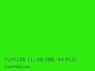 YUV 156.11,-68.088,-94.812 Color is a normal green color and the nearest color is Neon Green #39ff14. Hex code #30ee12 and RGB value is rgb(48,238,18). In RGB color space, this color is composed of 19% red, 93% green, 7% blue, In CMYK color space, this color is composed of 80% cyan, 0% magenta, 92% yellow , 7% black , In HSL color space, this color has a hue angle of 112° , 87% saturation and 50% lightness.