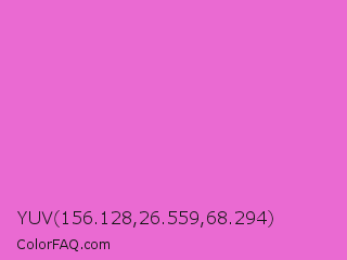 YUV 156.128,26.559,68.294 Color is a light magenta color and the nearest color is Orchid #da70d6. Hex code #ea6ad2 and RGB value is rgb(234,106,210). In RGB color space, this color is composed of 92% red, 42% green, 82% blue, In CMYK color space, this color is composed of 0% cyan, 55% magenta, 10% yellow , 8% black , In HSL color space, this color has a hue angle of 311° , 75% saturation and 67% lightness.