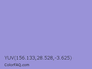 YUV 156.133,28.528,-3.625 Color is a light indigo color and the nearest color is Blue Bell Crayola #9999cc. Hex code #9893d6 and RGB value is rgb(152,147,214). In RGB color space, this color is composed of 60% red, 58% green, 84% blue, In CMYK color space, this color is composed of 29% cyan, 31% magenta, 0% yellow , 16% black , In HSL color space, this color has a hue angle of 244° , 45% saturation and 71% lightness.