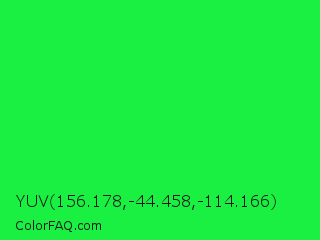 YUV 156.178,-44.458,-114.166 Color is a normal green color and the nearest color is Malachite #0bda51. Hex code #1af042 and RGB value is rgb(26,240,66). In RGB color space, this color is composed of 10% red, 94% green, 26% blue, In CMYK color space, this color is composed of 89% cyan, 0% magenta, 73% yellow , 6% black , In HSL color space, this color has a hue angle of 131° , 88% saturation and 52% lightness.