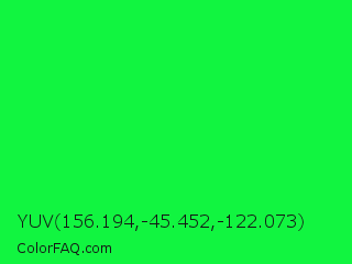 YUV 156.194,-45.452,-122.073 Color is a normal green color and the nearest color is Malachite #0bda51. Hex code #11f540 and RGB value is rgb(17,245,64). In RGB color space, this color is composed of 7% red, 96% green, 25% blue, In CMYK color space, this color is composed of 93% cyan, 0% magenta, 74% yellow , 4% black , In HSL color space, this color has a hue angle of 132° , 92% saturation and 51% lightness.