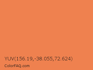 YUV 156.19,-38.055,72.624 Color is a light orange color and the nearest color is Mandarin #f37a48. Hex code #ef814f and RGB value is rgb(239,129,79). In RGB color space, this color is composed of 94% red, 51% green, 31% blue, In CMYK color space, this color is composed of 0% cyan, 46% magenta, 67% yellow , 6% black , In HSL color space, this color has a hue angle of 19° , 83% saturation and 62% lightness.