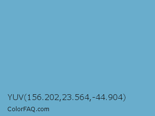 YUV 156.202,23.564,-44.904 Color is a light blue color and the nearest color is Iceberg #71a6d2. Hex code #69adcc and RGB value is rgb(105,173,204). In RGB color space, this color is composed of 41% red, 68% green, 80% blue, In CMYK color space, this color is composed of 49% cyan, 15% magenta, 0% yellow , 20% black , In HSL color space, this color has a hue angle of 199° , 49% saturation and 61% lightness.