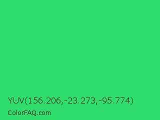 YUV 156.206,-23.273,-95.774 Color is a normal green color and the nearest color is UFO Green #3cd070. Hex code #2fdd6d and RGB value is rgb(47,221,109). In RGB color space, this color is composed of 18% red, 87% green, 43% blue, In CMYK color space, this color is composed of 79% cyan, 0% magenta, 51% yellow , 13% black , In HSL color space, this color has a hue angle of 141° , 72% saturation and 53% lightness.