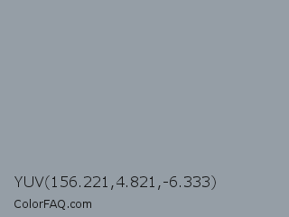 YUV 156.221,4.821,-6.333 Color is a light blue color and the nearest color is Manatee #979aaa. Hex code #959ea6 and RGB value is rgb(149,158,166). In RGB color space, this color is composed of 58% red, 62% green, 65% blue, In CMYK color space, this color is composed of 10% cyan, 5% magenta, 0% yellow , 35% black , In HSL color space, this color has a hue angle of 208° , 9% saturation and 62% lightness.