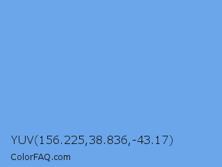 YUV 156.225,38.836,-43.17 Color is a light blue color and the nearest color is Blue Jeans #5dadec. Hex code #6ba6eb and RGB value is rgb(107,166,235). In RGB color space, this color is composed of 42% red, 65% green, 92% blue, In CMYK color space, this color is composed of 54% cyan, 29% magenta, 0% yellow , 8% black , In HSL color space, this color has a hue angle of 212° , 76% saturation and 67% lightness.