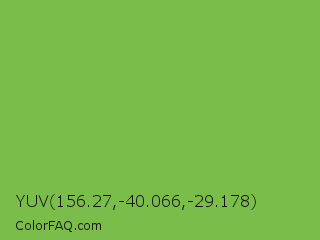 YUV 156.27,-40.066,-29.178 Color is a normal green color and the nearest color is Bud Green #7bb661. Hex code #7bbd4b and RGB value is rgb(123,189,75). In RGB color space, this color is composed of 48% red, 74% green, 29% blue, In CMYK color space, this color is composed of 35% cyan, 0% magenta, 60% yellow , 26% black , In HSL color space, this color has a hue angle of 95° , 46% saturation and 52% lightness.