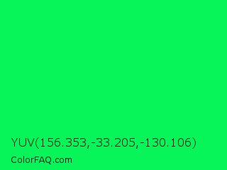 YUV 156.353,-33.205,-130.106 Color is a normal green color and the nearest color is Malachite #0bda51. Hex code #08f559 and RGB value is rgb(8,245,89). In RGB color space, this color is composed of 3% red, 96% green, 35% blue, In CMYK color space, this color is composed of 97% cyan, 0% magenta, 64% yellow , 4% black , In HSL color space, this color has a hue angle of 141° , 94% saturation and 50% lightness.