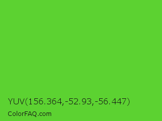 YUV 156.364,-52.93,-56.447 Color is a normal green color and the nearest color is Harlequin Green #46cb18. Hex code #5cd231 and RGB value is rgb(92,210,49). In RGB color space, this color is composed of 36% red, 82% green, 19% blue, In CMYK color space, this color is composed of 56% cyan, 0% magenta, 77% yellow , 18% black , In HSL color space, this color has a hue angle of 104° , 64% saturation and 51% lightness.