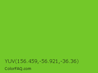 YUV 156.459,-56.921,-36.36 Color is a normal green color and the nearest color is Lima #76bd17. Hex code #73c829 and RGB value is rgb(115,200,41). In RGB color space, this color is composed of 45% red, 78% green, 16% blue, In CMYK color space, this color is composed of 43% cyan, 0% magenta, 80% yellow , 22% black , In HSL color space, this color has a hue angle of 92° , 66% saturation and 47% lightness.
