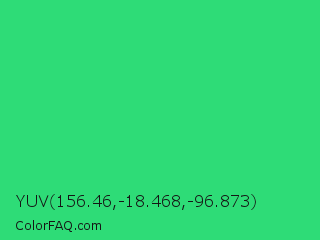 YUV 156.46,-18.468,-96.873 Color is a normal green color and the nearest color is UFO Green #3cd070. Hex code #2edc77 and RGB value is rgb(46,220,119). In RGB color space, this color is composed of 18% red, 86% green, 47% blue, In CMYK color space, this color is composed of 79% cyan, 0% magenta, 46% yellow , 14% black , In HSL color space, this color has a hue angle of 145° , 71% saturation and 52% lightness.