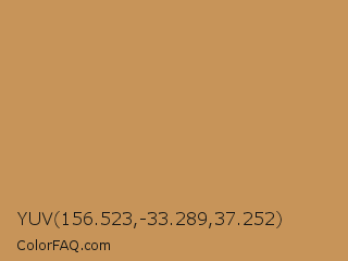 YUV 156.523,-33.289,37.252 Color is a normal orange color and the nearest color is Twine #c2955d. Hex code #c79459 and RGB value is rgb(199,148,89). In RGB color space, this color is composed of 78% red, 58% green, 35% blue, In CMYK color space, this color is composed of 0% cyan, 26% magenta, 55% yellow , 22% black , In HSL color space, this color has a hue angle of 32° , 50% saturation and 56% lightness.