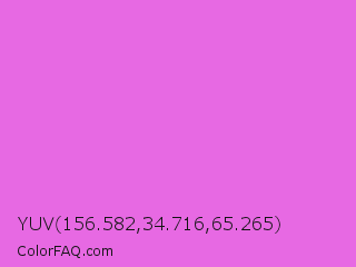 YUV 156.582,34.716,65.265 Color is a light magenta color and the nearest color is Orchid #da70d6. Hex code #e769e3 and RGB value is rgb(231,105,227). In RGB color space, this color is composed of 91% red, 41% green, 89% blue, In CMYK color space, this color is composed of 0% cyan, 55% magenta, 2% yellow , 9% black , In HSL color space, this color has a hue angle of 302° , 72% saturation and 66% lightness.