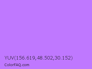YUV 156.619,48.502,30.152 Color is a light purple color and the nearest color is Heliotrope #df73ff. Hex code #bf78ff and RGB value is rgb(191,120,255). In RGB color space, this color is composed of 75% red, 47% green, 100% blue, In CMYK color space, this color is composed of 25% cyan, 53% magenta, 0% yellow , 0% black , In HSL color space, this color has a hue angle of 272° , 100% saturation and 74% lightness.