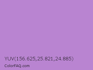 YUV 156.625,25.821,24.885 Color is a light purple color and the nearest color is Lavender #b57edc. Hex code #b984d1 and RGB value is rgb(185,132,209). In RGB color space, this color is composed of 73% red, 52% green, 82% blue, In CMYK color space, this color is composed of 11% cyan, 37% magenta, 0% yellow , 18% black , In HSL color space, this color has a hue angle of 281° , 46% saturation and 67% lightness.