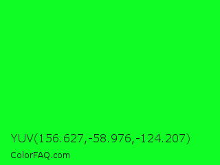 YUV 156.627,-58.976,-124.207 Color is a normal green color and the nearest color is Green #00ff00. Hex code #0ffc25 and RGB value is rgb(15,252,37). In RGB color space, this color is composed of 6% red, 99% green, 15% blue, In CMYK color space, this color is composed of 94% cyan, 0% magenta, 85% yellow , 1% black , In HSL color space, this color has a hue angle of 126° , 98% saturation and 52% lightness.