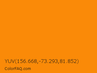 YUV 156.668,-73.293,81.852 Color is a normal orange color and the nearest color is Dark Orange #ff8c00. Hex code #fa8a08 and RGB value is rgb(250,138,8). In RGB color space, this color is composed of 98% red, 54% green, 3% blue, In CMYK color space, this color is composed of 0% cyan, 45% magenta, 97% yellow , 2% black , In HSL color space, this color has a hue angle of 32° , 96% saturation and 51% lightness.