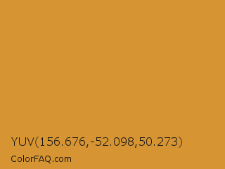 YUV 156.676,-52.098,50.273 Color is a normal orange color and the nearest color is Tigers Eye #e08d3c. Hex code #d69433 and RGB value is rgb(214,148,51). In RGB color space, this color is composed of 84% red, 58% green, 20% blue, In CMYK color space, this color is composed of 0% cyan, 31% magenta, 76% yellow , 16% black , In HSL color space, this color has a hue angle of 36° , 67% saturation and 52% lightness.