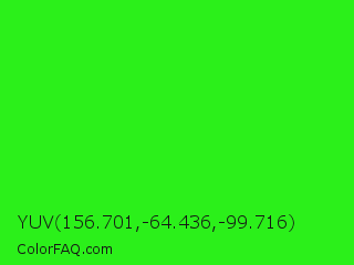 YUV 156.701,-64.436,-99.716 Color is a normal green color and the nearest color is Neon Green #39ff14. Hex code #2bf01a and RGB value is rgb(43,240,26). In RGB color space, this color is composed of 17% red, 94% green, 10% blue, In CMYK color space, this color is composed of 82% cyan, 0% magenta, 89% yellow , 6% black , In HSL color space, this color has a hue angle of 115° , 88% saturation and 52% lightness.