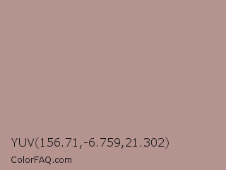YUV 156.71,-6.759,21.302 Color is a light red color and the nearest color is Rosy Brown #bc8f8f. Hex code #b5938f and RGB value is rgb(181,147,143). In RGB color space, this color is composed of 71% red, 58% green, 56% blue, In CMYK color space, this color is composed of 0% cyan, 19% magenta, 21% yellow , 29% black , In HSL color space, this color has a hue angle of 6° , 20% saturation and 64% lightness.