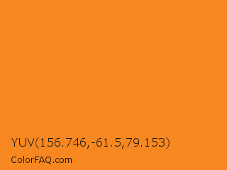 YUV 156.746,-61.5,79.153 Color is a normal orange color and the nearest color is Princeton Orange #f58025. Hex code #f78720 and RGB value is rgb(247,135,32). In RGB color space, this color is composed of 97% red, 53% green, 13% blue, In CMYK color space, this color is composed of 0% cyan, 45% magenta, 87% yellow , 3% black , In HSL color space, this color has a hue angle of 29° , 93% saturation and 55% lightness.